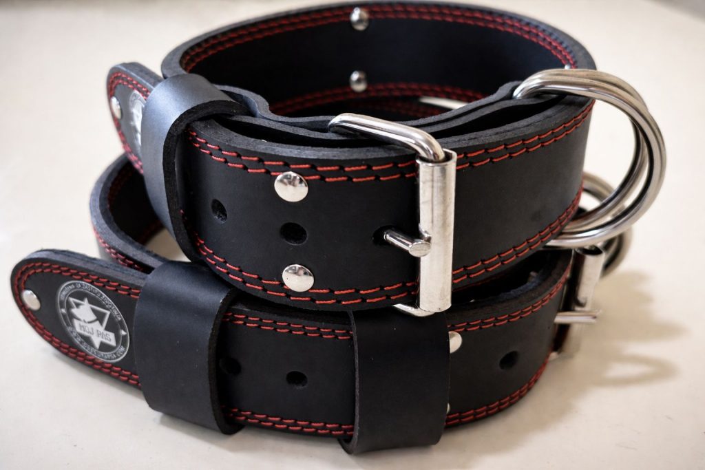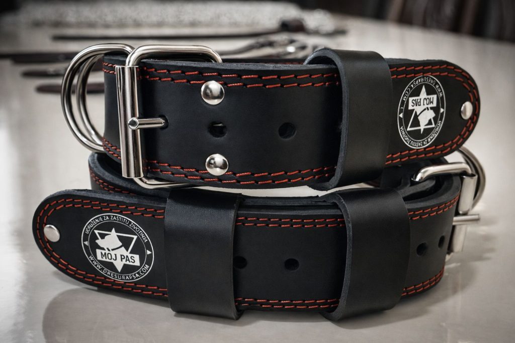 Kožne sigurnosne ogrlice za pse „MOJ PAS“, izrađene od goveđe kože, visokog kvaliteta, duplo prošivene plastificiranim koncem, sa dodatim ojačanjima, duple alke, proizvedene u tri veličine 65 cm, 75 cm i 90 cm, širine 5 cm, debljina 6mm: 65 cm širina 5 cm cena 3200,00 din (5 rupica od 41-51cm), 75 cm širina 5 cm cena 3900,00 din (5 rupica od 52-62 cm) i 90 cm širina 5 cm cena 4500,00 din (9 rupica od 52-74cm)