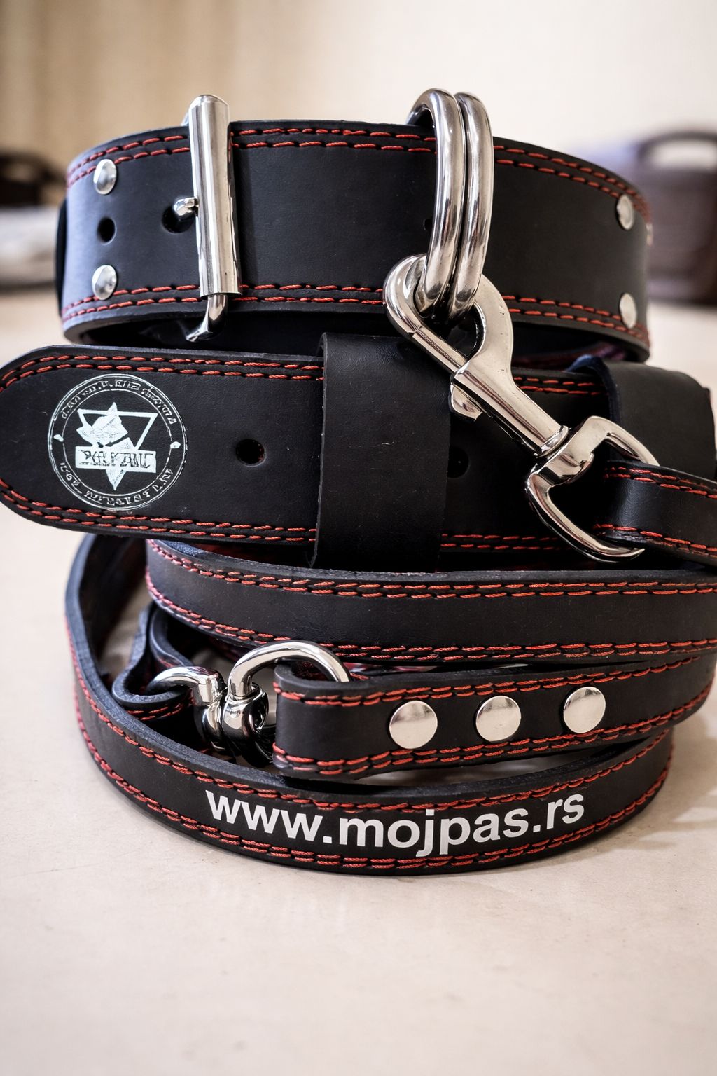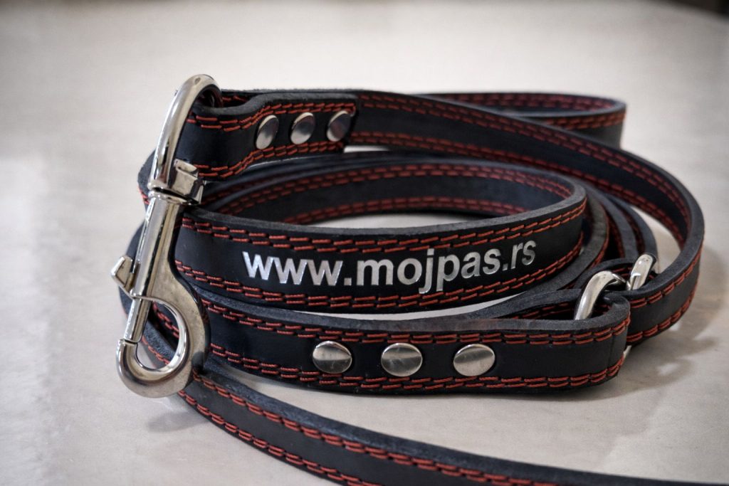 Kožna ogrlica za pse „MOJ PAS“ sa ručkom, duplo prošivena goveđom kožom plastificiranim koncem, namenjena za naprednu obuku psa, idealna za vođenje psa uz nogu, visokog kvaliteta, dužina 65 cm, širina 4 cm, debljina 6mm, 5 rupica (od 46cm do 56cm), cena 3600 dinara.